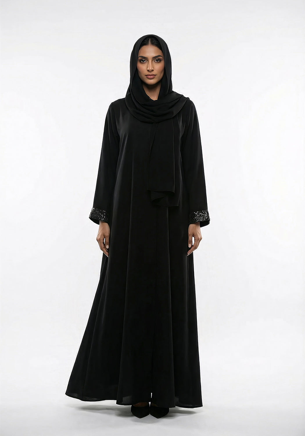Our Jade black abaya from the mother-and-daughter collection is a timeless and sophisticated choice for any occasion. Crafted from a luxurious, comfortable fabric, this elegant abaya features beautifully sequined sleeves that add a touch of sparkle and refinement. The matching hijab completes the look, creating a seamless look.