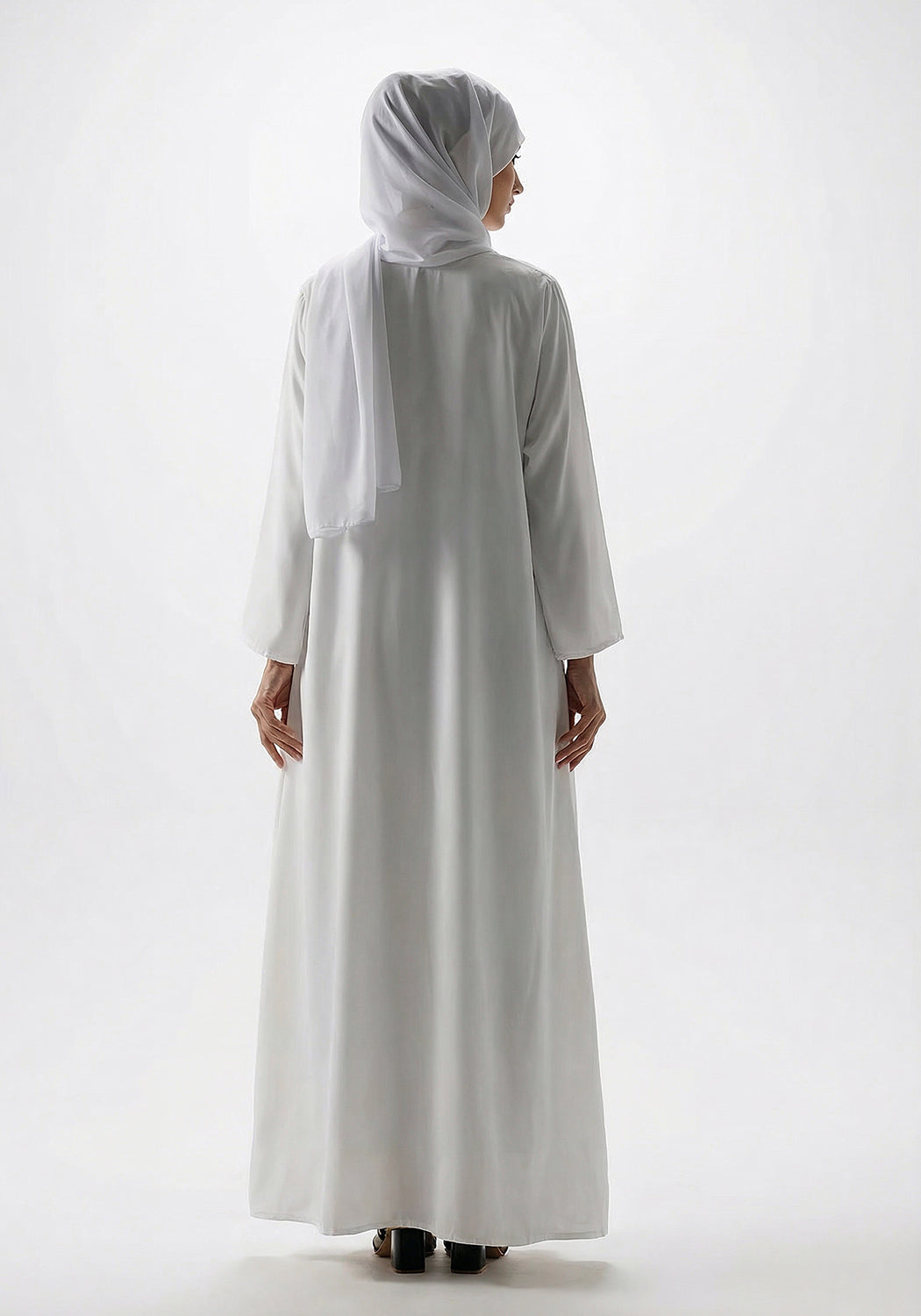Experience effortless elegance with our pure white front-open abaya, designed to give a fresh and airy look. Featuring a clean round neckline, a convenient front-open design, and practical side pockets, this abaya blends simplicity with everyday comfort. Perfect for casual outings or modest daily wear.