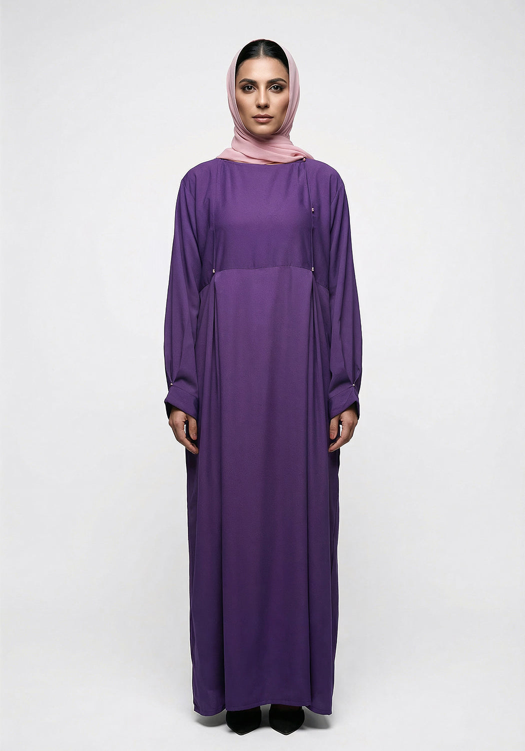 Add a touch of elegance to your wardrobe with our beautiful purple abaya, featuring box pleats on the front and sleeves and adorned with pink pearl buttons for a sophisticated accent. Complete with a contrasting pink scarf, this stylish abaya creates a polished, coordinated look perfect for casual outings and modest fashion.