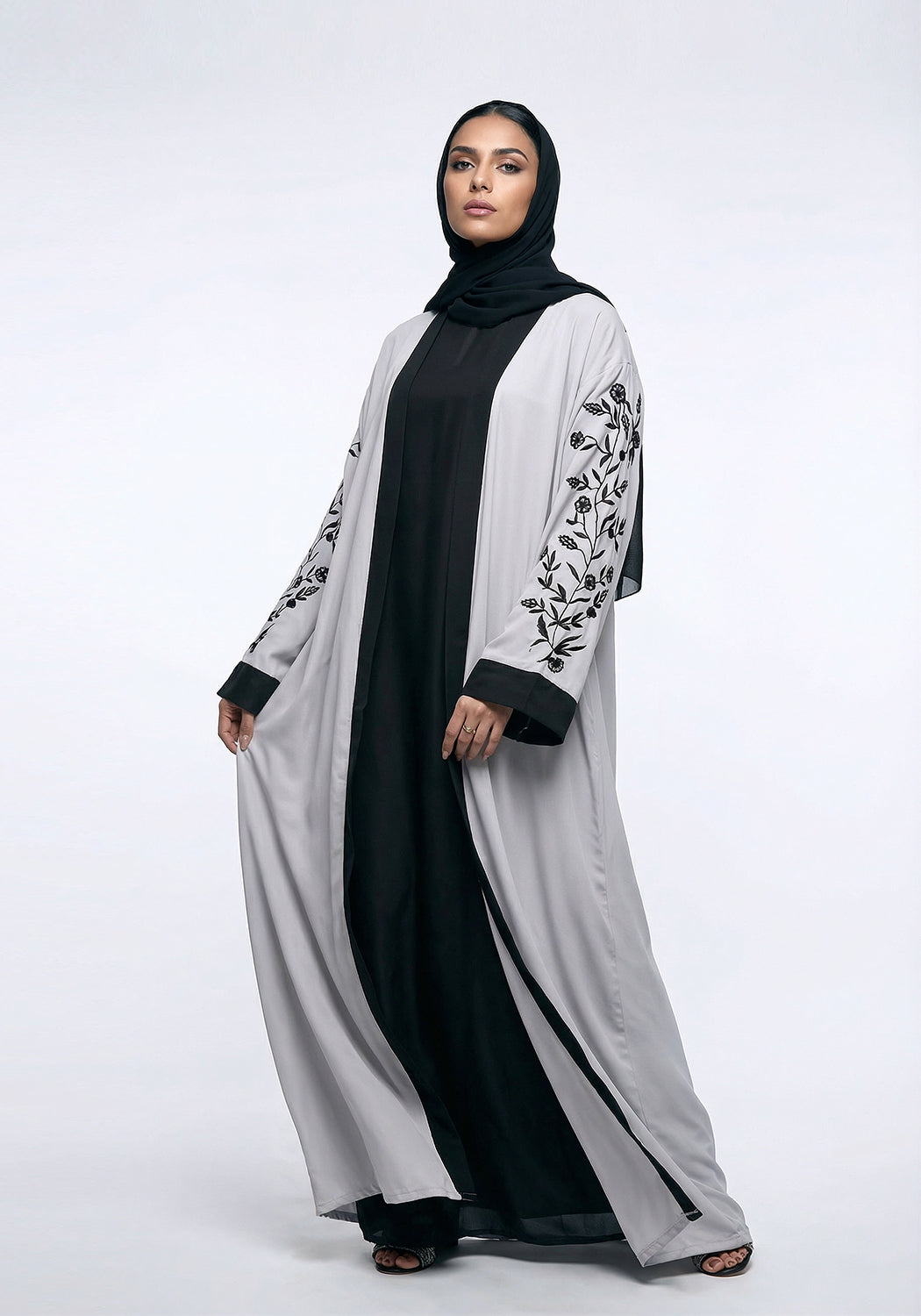Feeling beautiful and elegant, our grey and black Zenda abaya is the one for you! It has a black inner with a grey upper with embroidery on the sleeves. A cool twist of modern design, this abaya will keep you comfortable and stylish.