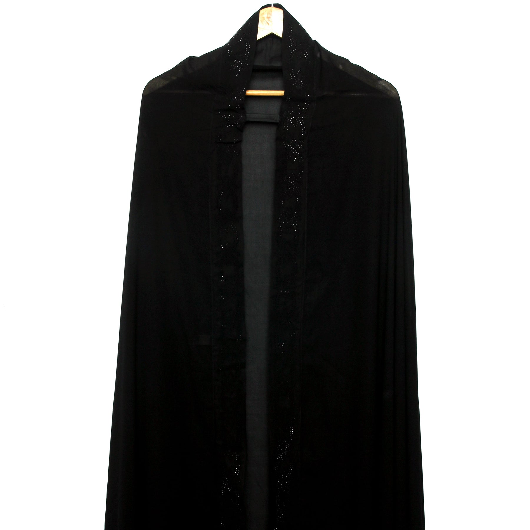 Expertly crafted from high-quality wool chiffon, this Black Stone Bow Flower - Irani Chadar is a luxurious and versatile option for your wardrobe. With a width of 144" and a height of 64", it offers ample coverage and comfort. Measuring 4.25 meters, it provides you with a perfect fit and effortless elegance.