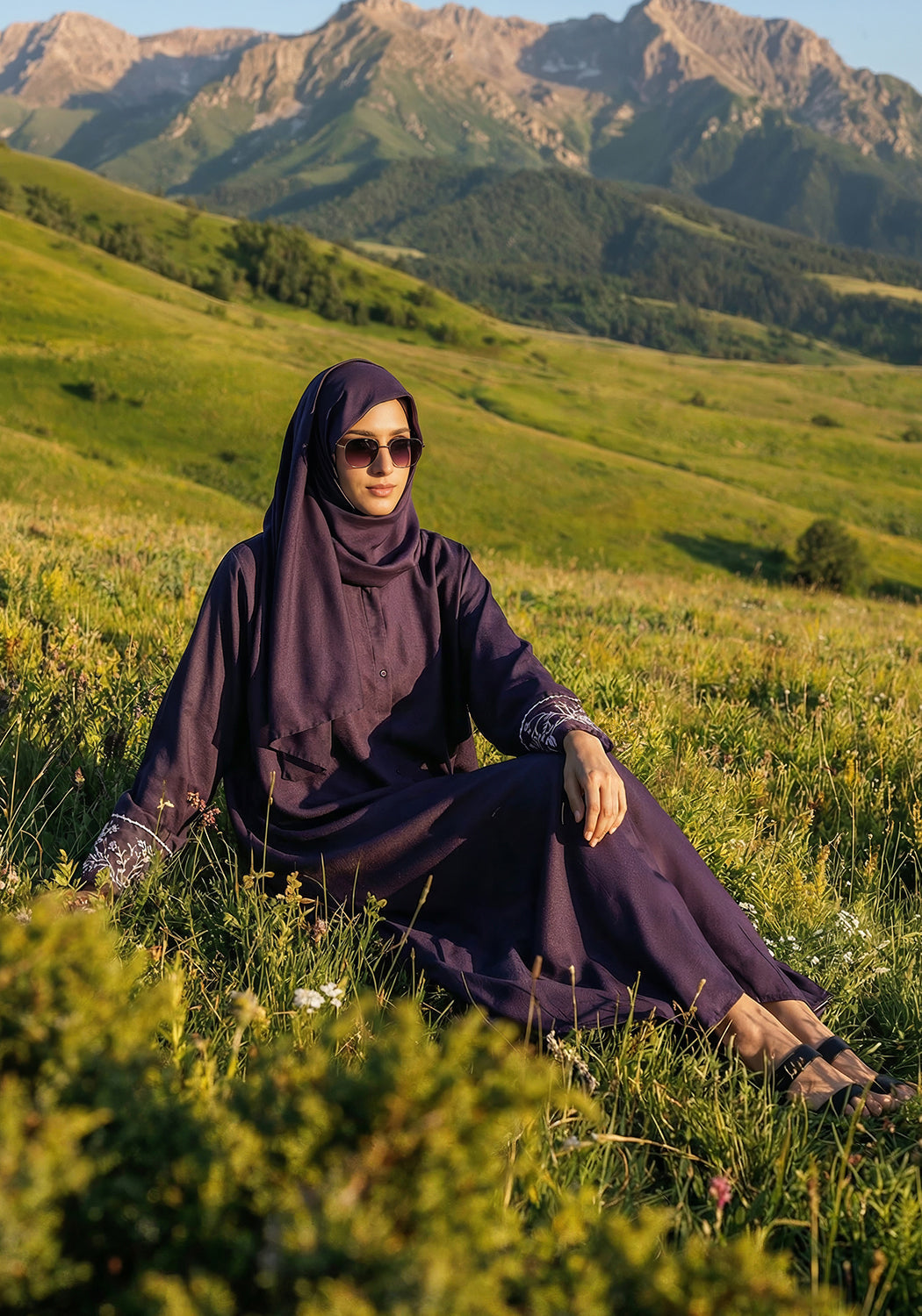 This elegant abaya features luxurious Nida fabric, offering a smooth and comfortable drape. The standout detail is the intricate Dapka work adorning the sleeves, adding a refined touch of craftsmanship. Perfect for those seeking a sophisticated and graceful look, this purple abaya combines timeless style with subtle embellishment.